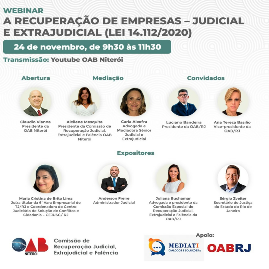 Ana Tereza Basílio e Luciano Bandeira, respectivamente, vice-presidente e presidente reeleitos da OAB-RJ, são convidados da Webinar “A recuperação de empresas-judicial e extrajudicial ( Lei 14.112/2020)”, nesta quarta (24), das 9h30 às 11h30, pelo youtube da OAB de Niterói. Claudio Vianna, presidente da OAB de Niterói, fará a abertura e as advogadas Alcilene Mesquita e Carla Alcofra farão a mediação do encontro virtual. Sergio Sveiter, atual secretário de Justiça do Rio de Janeiro, será um dos expositores do evento.