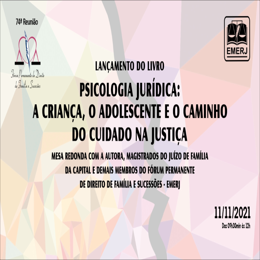 A psicóloga Glicia Brazil, membra do Fórum Permanente de Direito de Família e Sucessões da Escola da Magistratura do Estado do Rio de Janeiro (EMERJ) e especialista em Recursos Humanos pela Universidade Pontifícia Católica (PUC/RJ), lançará o livro Psicologia Jurídica: a criança, o adolescente e o caminho do cuidado na Justiça. O evento é realizado pelo Fórum Permanente de Direito de Família e Sucessões e pelo Instituto Brasileiro de Direito de Família (IBDFAM). No dia 11, às 9h30, por meio das plataformas Zoom e YouTube, haverá uma mesa redonda com a autora, magistrados do juízo de família da capital e os demais membros do Fórum da EMERJ. A abertura do encontro será feita pela desembargadora Kátya Maria Monnerat, presidente do Fórum.