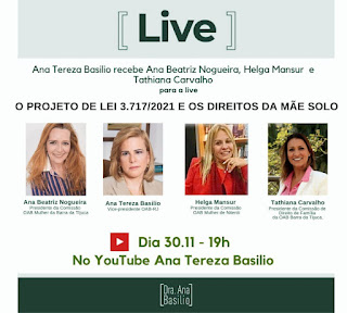 Ana Tereza Basílio, vice-presidente da OAB-RJ, vai receber para live na próxima terça-feira (30), às 19h, as advogadas Ana Beatriz Nogueira, presidente da OAB Mulher da Barra da Tijuca, Helga Mansur, presidente da OAB Mulher de Niterói, e Tathiana Carvalho, presidente da Comissão de Direito de Família da OAB da Barra da Tijuca. O tema do encontro virtual é “O Projeto de Lei 3.717/2021 e os Direitos da Mãe Solo”. A transmissão será pelo youtube de Ana Tereza Basílio.