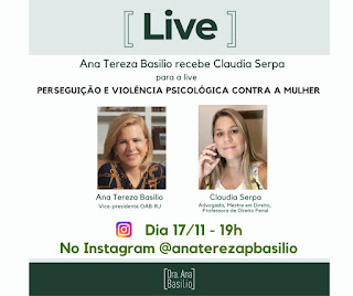 Ana Tereza Basílio, vice-presidente da OAB-RJ, e a advogada Claudia Serpa, professora de Direito Penal, vão debater, na próxima quarta-feira, dia 17, a “Perseguição e Violência Psicológica contra a Mulher “. O encontro virtual será às 19h, pelo Instagram de Ana Tereza Basílio.
