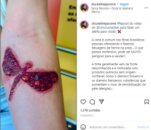 Inclusive, a especialista destaca um vídeo que tem circulado na internet, de um rapaz que tatuou uma libélula de henna, provocando uma queimadura de segundo grau, com bolhas, em função destes pigmentos presentes nestas tintas.