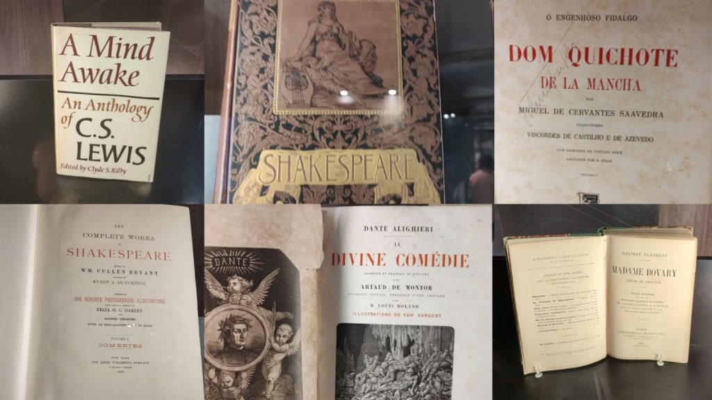 Borges escreveu sobre a maioria dos livros e escritores da mostra: “A Divina Comédia”, “Dom Quixote”, a dramaturgia de Shakespeare, “Decameron”, Montaigne, Beaudelaire, Honoré de Balzac, Victor Hugo, Charles Dickens, Kafka, Proust, James Joyce, entre outros. Uma ala especial é reservada às primeiras edições dos grandes escritores brasileiros e latinos como Garcia Marquez, Fernando Pessoa, Eça de Queiroz, Saramago, Machado de Assis, Guimarães Rosa e Mario de Andrade.