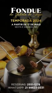 Dirigida por Beth Serpa e Carlos Alberto Serpa, a Casa Julieta de Serpa voltou a receber o famoso Fondue, um dos pratos mais procurados, na temporada gastronômica de outono e inverno. O Festival de Fondue será, sempre, às sextas-feiras e sábados, das 19h às 23h30, no Salão Blason. As opções, para duas pessoas, são de fondues de doce de leite, com queijo minas, mini churros uva e morango, a R$157, fondue de chocolate, a R$ 157, fondue de queijo, de R$ 195, e fondue de carne, de R$ 215.