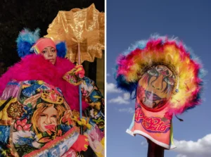 Aqui, é tudo sobre os figurinos. Nos últimos meses, Vieira, um engenheiro mecânico, e vários outros membros montaram os figurinos deste ano. Junto com a máscara, o resto do figurino consiste em uma saia caprichosa e cheia de babados, meias coloridas incandescentes, coletes enfeitados com penas e cocares.