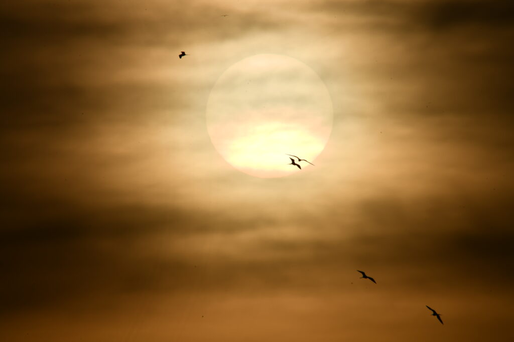 O Astro-Rei por sua vez está ao som de Chico. Através da objetiva, percebo entre raios, luminosidade e equilíbrio sobre a cumulus nimbus que, bebeu e soluçou como se fosse um náufrago, um pássaro como uma das fragatas que ainda ensaiam seu balé matinal, com todo açúcar e muito afeto, muitas vezes descompassadas de amor.